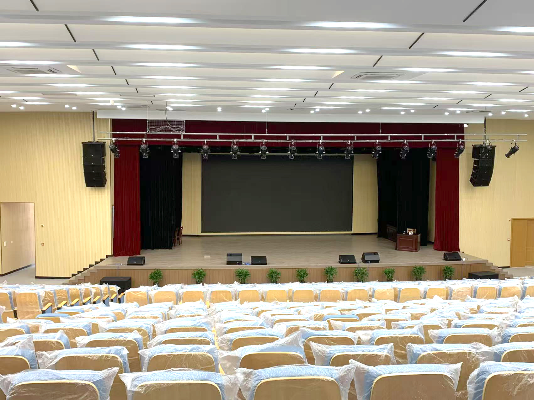 报告厅舞台通过顶光灯、侧光灯、面光灯共同组成,4种不同的灯具共同萦绕出绚丽的灯光,在满足会议照明的同时也兼顾了舞台的演出效果。