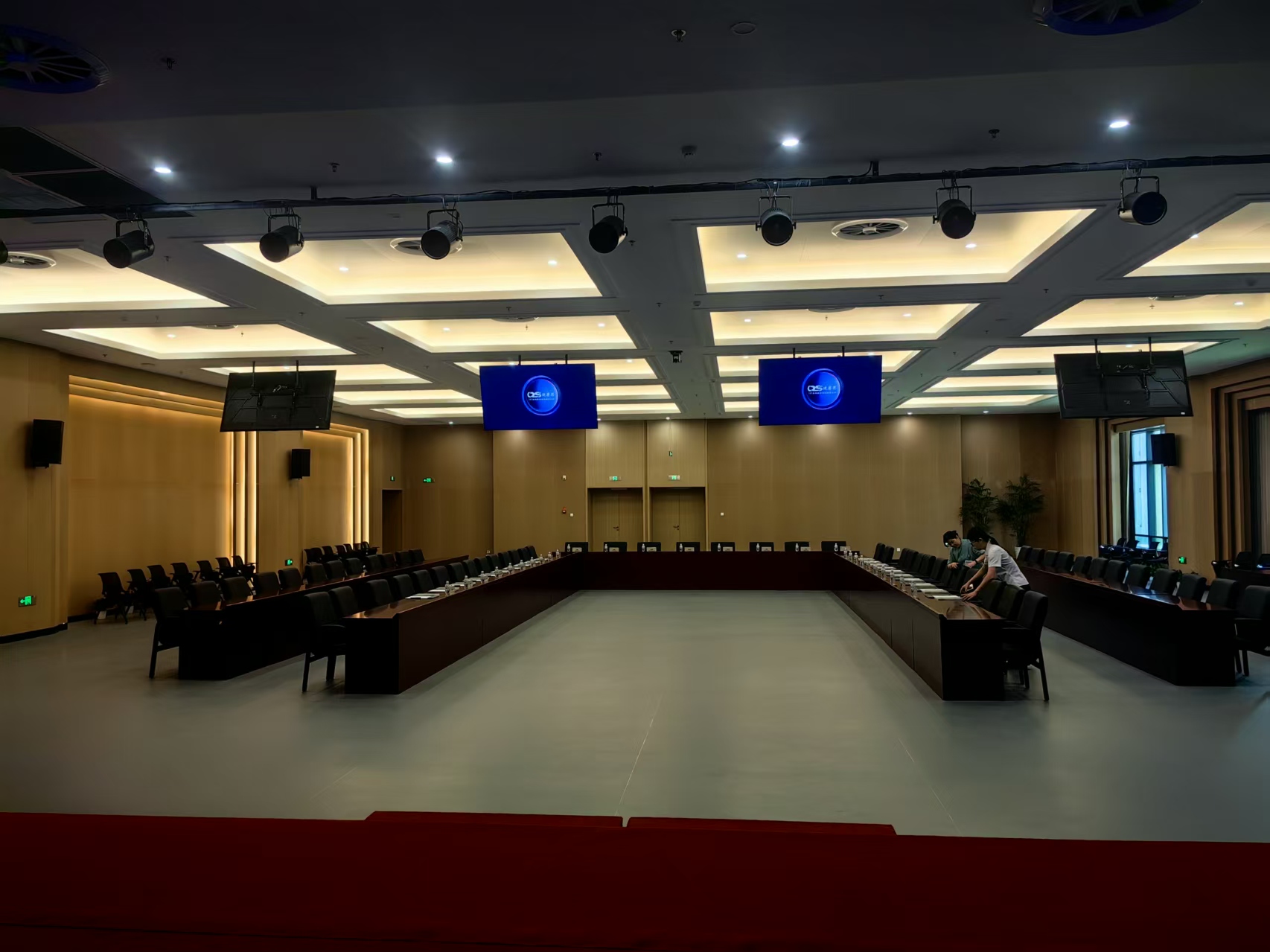 中控系统满足对会议室音视频进行实时切换调度,中控系统采用无线触摸屏进行操作,中控主机和无线触屏根据会议室时间使用情况,编辑运行控制程序,下载到中控主机和无线触摸屏进行控制运行,在无线触摸屏的控制下,达到音视频切换实时操控,解决繁琐操作,轻松控制会议室室内各种系统受控设备操作。